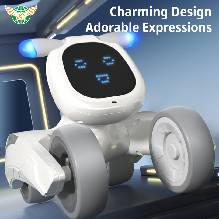 😊 يتميز بوجه LED يُظهر تعبيرات لطيفة ومتحركة تتغير حسب التفاعل، مما يضفي طابعًا إنسانيًا على الروبوت ويزيد من تقارب الطفل معه.